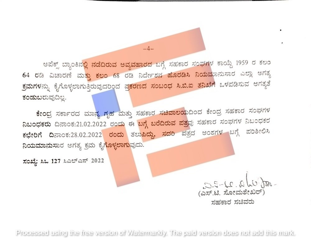 ಬ್ಯಾಂಕ್ನ ಅವ್ಯವಹಾರಗಳಿಗೆ ಸಂಬಂಧಿಸಿದಂತೆ ಕೇಂದ್ರದ ಗೃಹ ಮತ್ತು ಸಹಕಾರ ಸಚಿವಾಲಯದ ಕೇಂದ್ರ ಸಹಕಾರ ಸಂಘಗಳ ನಿಬಂಧಕರು 2022ರ ಫೆ.21ರಂದು ರಾಜ್ಯ ಸರ್ಕಾರಕ್ಕೆ ಪತ್ರ ಬರೆದಿತ್ತು. ಬೆನ್ನಲ್ಲೇ ಸಿಬಿಐ ತನಿಖೆಗೆ ಒಳಪಡಿಸದಿರಲು ನಿಲುವು ತಳೆದಿತ್ತು.