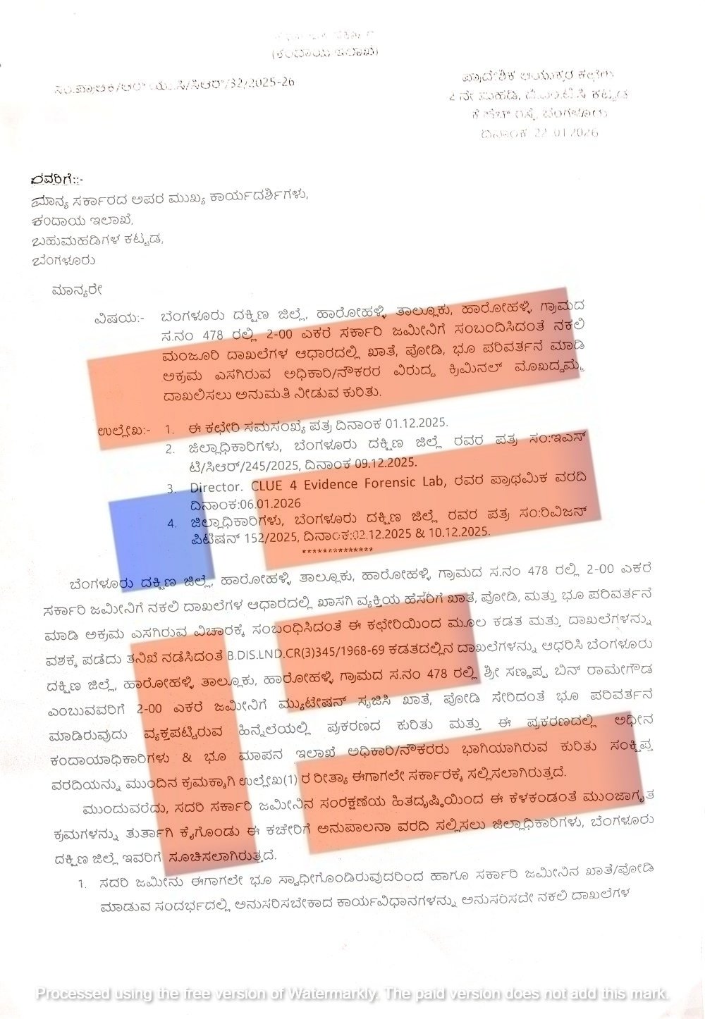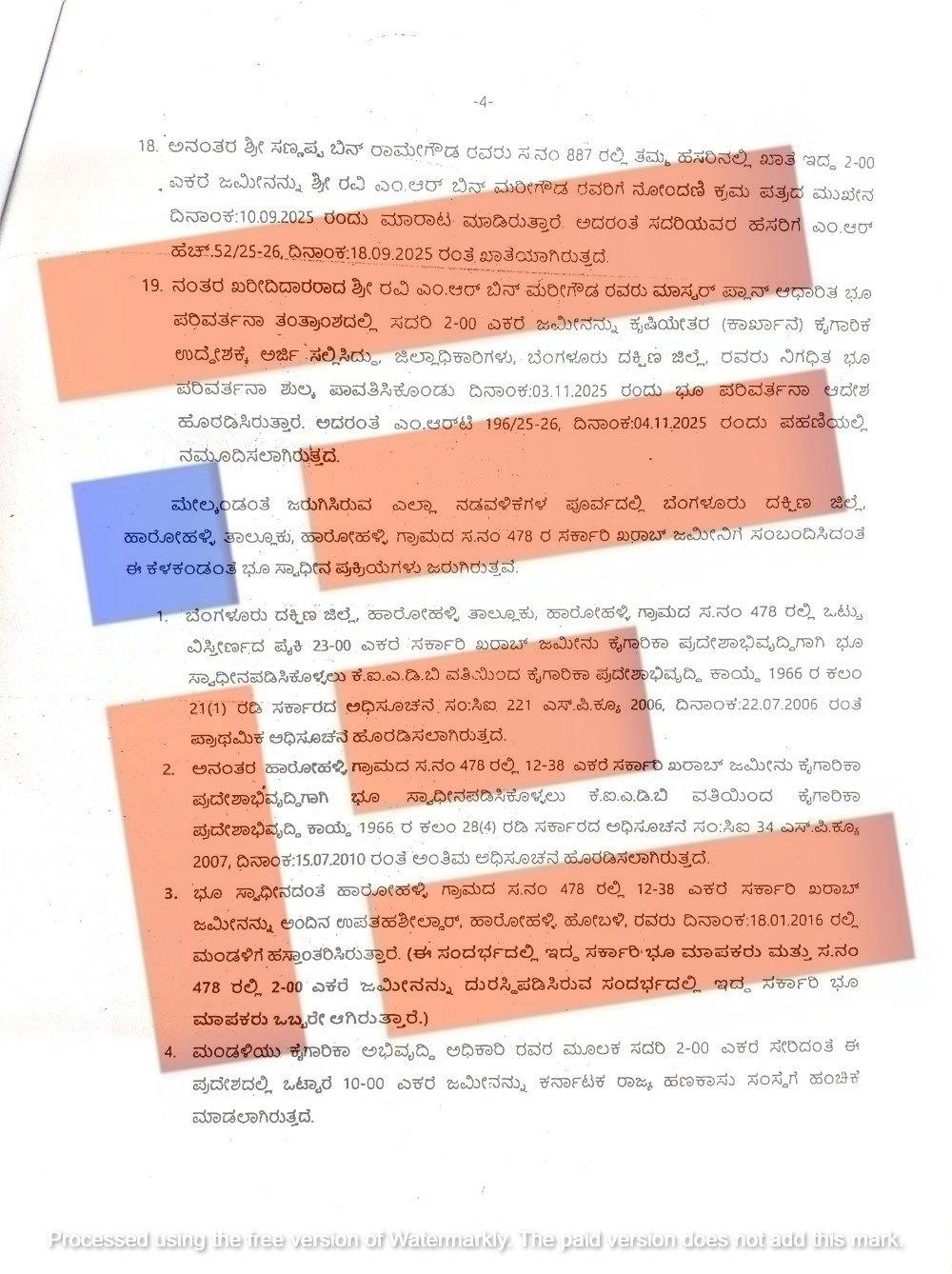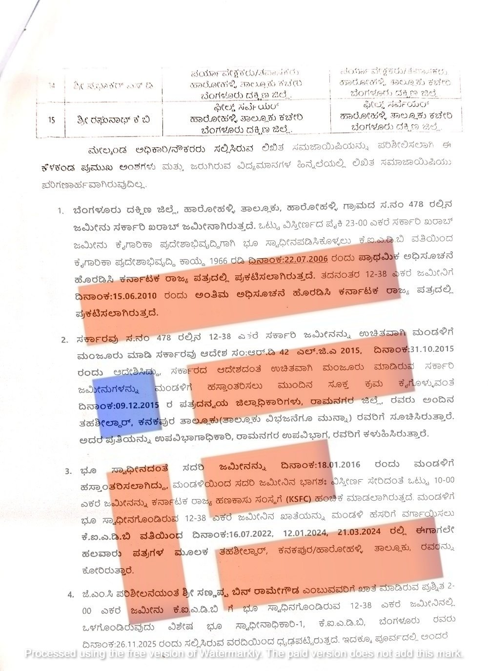 ಈ ಮನವಿ ಆಧರಿಸಿ ಜಮೀನಿನ ದಾಖಲೆಗಳ ನೈಜತೆ ಕುರಿತು ವಿಶೇಷ ಭೂ ಸ್ವಾಧೀನಾಧಿಕಾರಿ 2024ರ ಜನವರಿ 18ರಂದು ತಹಶೀಲ್ದಾರ್ಗೆ ವರದಿ ಸಲ್ಲಿಸಿದ್ದರು. ಈ ವರದಿ ಪ್ರಕಾರ ಸರ್ವೆ ನಂಬರ್ 478ರಲ್ಲಿನ ಜಮೀನು, ಹಾರೋಹಳ್ಳಿ ಕೈಗಾರಿಕೆ ಪ್ರದೇಶದಲ್ಲಿ ಭೂ ಸ್ವಾಧೀನಪಡಿಸಿಕೊಳ್ಳಲಾಗಿರುವ ವ್ಯಾಪ್ತಿಯೊಳಗಿತ್ತು. ಇದೇ ಅಂಶವನ್ನು 2025ರ ನವೆಂಬರ್ 26ರಂದು ಸಲ್ಲಿಸಿದ್ದ ವರದಿಯಲ್ಲಿಯೂ ದೃಢಪಡಿಸಲಾಗಿತ್ತು. ಆದರೂ ಸಹ ಸಣ್ಣಪ್ಪ ಎಂಬುವರ ಹೆಸರಿಗೆ ಈ ಜಮೀನನ್ನು ಖಾತೆ ಮಾಡಿಕೊಡಲಾಗಿತ್ತು.
