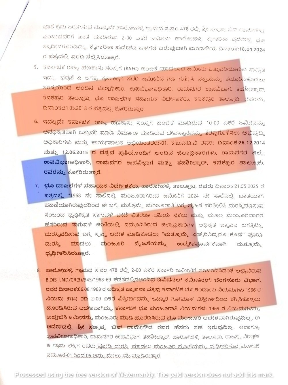 ಕರ್ನಾಟಕ ಕೈಗಾರಿಕೆ ಪ್ರದೇಶಾಭಿವೃದ್ಧಿ ಮಂಡಳಿಗೆ ಭೂ ಸ್ವಾಧೀನಗೊಂಡಿರುವ 12 ಎಕರೆ 38 ಗುಂಟೆ ವಿಸ್ತೀರ್ಣದ ಜಮೀನಿನ ಖಾತೆಯನ್ನು ಮಂಡಳಿ ಹೆಸರಿಗೆ ವರ್ಗಾಯಿಸಲು 2022ರ ಜುಲೈ 16, 2024ರ ಜನವರಿ 12 ಮತ್ತು 2024ರ ಮಾರ್ಚ್ 21ರಂದು ಹಲವು ಪತ್ರಗಳ ಮೂಲಕ ಕನಕಪುರ, ಹಾರೋಹಳ್ಳಿ ತಹಶೀಲ್ದಾರ್ಗೆ ಕೋರಿತ್ತು.