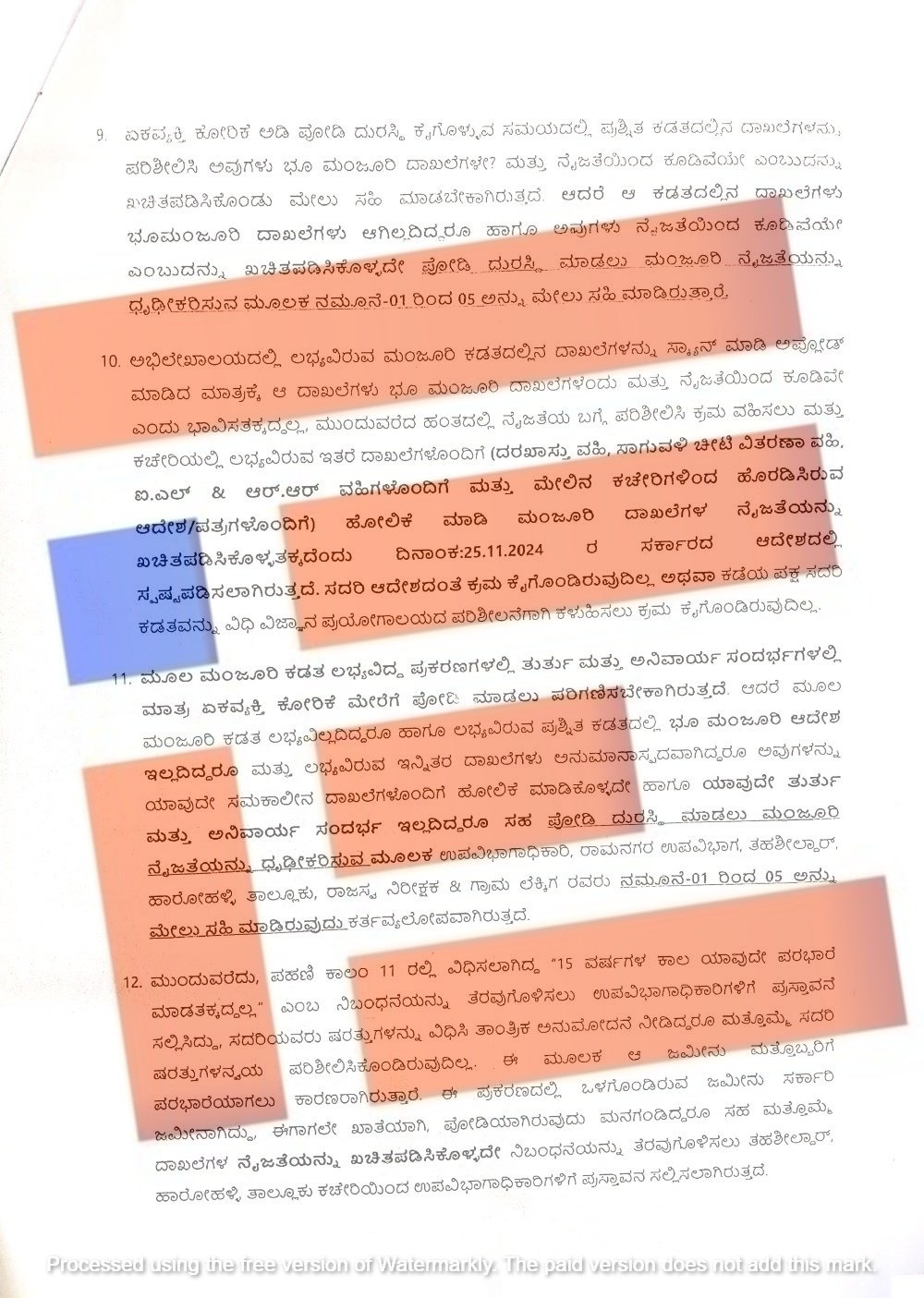 ಅದೇ ರೀತಿ ಭೂ ಮಂಜೂರಾಗಿರುವ ದಾಖಲೆಗಳನ್ನು ಸ್ಕ್ಯಾನ್ ಆಡಿ ಅಪ್ಲೋಡ್ ಮಾಡಿದ ಮಾತ್ರಕ್ಕೆ ಆ ದಾಖಲೆಗಳು ಭೂ ಮಂಜೂರಾತಿ ದಾಖಲೆಗಳು ಮತ್ತು ನೈಜತೆಯಿಂದ ಕೂಡಿವೆ ಎಂದು ಭಾವಿಸಬಾರದು. ದಾಖಲೆಗಳ ನೈಜತೆ ಬಗ್ಗೆ ಪರಿಶೀಲಿಸಿ ಕ್ರಮ ವಹಿಸಬೇಕು. ಮತ್ತು ಕಚೇರಿಯಲ್ಲಿ ಲಭ್ಯವಿರುವ ದರಖಾಸ್ತು ವಹಿ, ಸಾಗುವಳಿ ಚೀಟಿ ವಿತರಣೆ ವಹಿ, ಐ ಎಲ್ ಮತ್ತು ಆರ್ ಆರ್ ವಹಿಗಳೊಂದಿಗೆ ಹೋಲಿಕೆ ಮಾಡಬೇಕು. ಈ ಮೂಲಕ ಮಂಜೂರಾತಿಯಾಗಿರುವ ದಾಖಲೆಗಳ ನೈಜತೆಯನ್ನು ಖಚಿತಪಡಿಸಿಕೊಳ್ಳಬೇಕು ಎಂದು 2024ರ ನವೆಂಬರ್ 25ರಂದೇ ಆದೇಶ ಹೊರಡಿಸಿತ್ತು. ಆದರೂ ಈ ಆದೇಶದಂತೆ ಕ್ರಮ ವಹಿಸಿಲ್ಲ. ಅಷ್ಟೇ ಅಲ್ಲ ಕಡೇ ಪಕ್ಷ ಈ ಕಡತವನ್ನು ವಿಧಿ ವಿಜ್ಞಾನ ಪ್ರಯೋಗಾಲಯದ ಪರಿಶೀಲನೆಗೆ ಕಳಿಸಲೂ ಕ್ರಮ ಕೈಗೊಂಡಿಲ್ಲ.