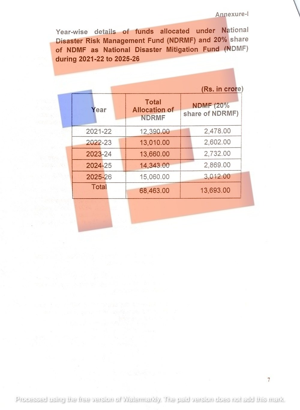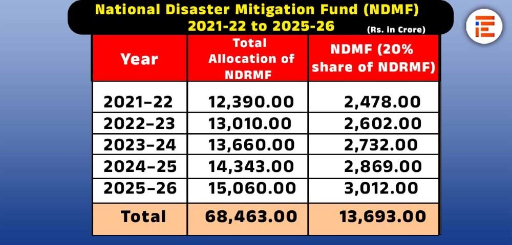 2021-22ರಲ್ಲಿ ಎನ್ಡಿಆರ್ಎಂಎಫ್ ಅಡಿಯಲ್ಲಿ 12,390 ಕೋಟಿ ಮತ್ತು ಎನ್ಡಿಎಂಎಫ್ಗೆ 2,478.00 ಕೋಟಿ ರು., 2022-23ರಲ್ಲಿ ಎನ್ಡಿಆರ್ಎಂಎಫ್ಗೆ 13,010 ಕೋಟಿ, ಎನ್ಡಿಎಂಎಫ್ಗೆ 2,602 ಕೋಟಿ, 2023-24ರಲ್ಲಿ ಎನ್ಡಿಆರ್ಎಂಎಫ್ಗೆ 13,660 ಕೋಟಿ, ಎನ್ಡಿಎಂಎಫ್ಗೆ 2,732 ಕೋಟಿ, 2024-25ರಲ್ಲಿ ಎನ್ಡಿಆರ್ಎಂಎಫ್ಗೆ 14,343 ಕೋಟಿ, ಎನ್ಡಿಎಂಎಫ್ಗೆ 2,869 ಕೋಟಿ, 2025-26ರಲ್ಲಿ ಎನ್ಡಿಎಆರ್ಎಂಎಫ್ಗೆ 15,060 ಕೋಟಿ ಸೇರಿ ಒಟ್ಟಾರೆ 68,463 ಕೋಟಿ ರು ಅನುದಾನ ಹಂಚಿಕೆ ಮಾಡಿತ್ತು.