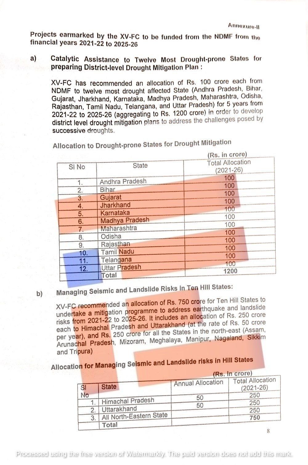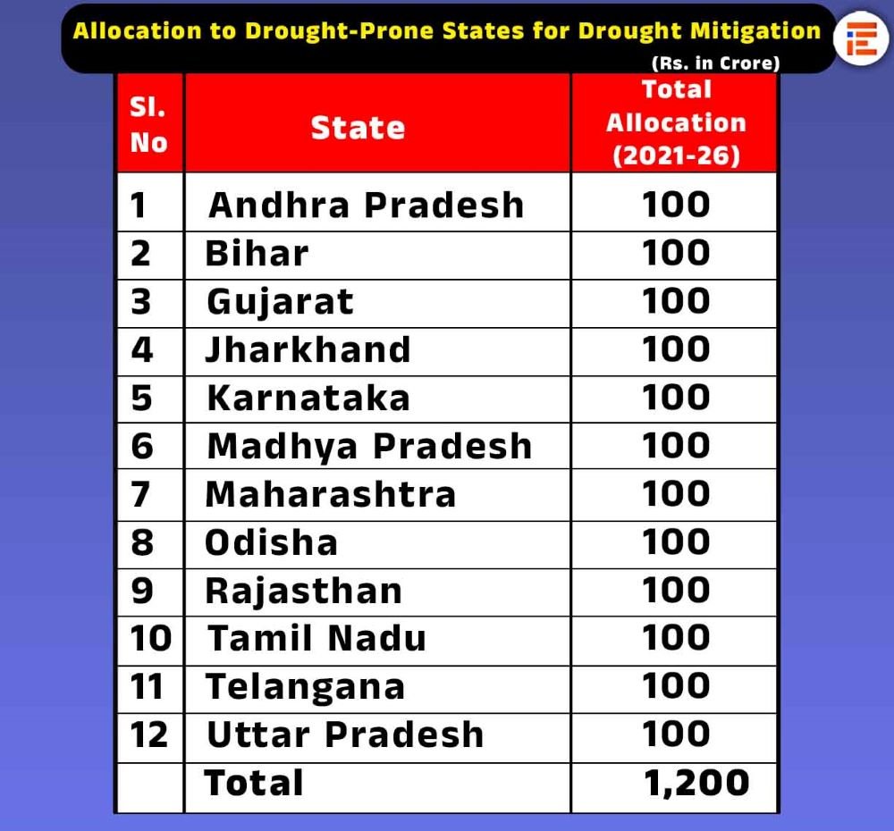 ಅಲ್ಲದೇ ಬರ ಪೀಡಿತ ಕರ್ನಾಟಕ, ಬಿಹಾರ, ಗುಜರಾತ್, ಜಾರ್ಖಂಡ್, ಮಧ್ಯ ಪ್ರದೇಶ, ಮಹಾರಾಷ್ಟ್ರ, ಒಡಿಶಾ, ರಾಜಸ್ಥಾನ, ತಮಿಳುನಾಡು, ತೆಲಂಗಾಣ, ಉತ್ತರ ಪ್ರದೇಶ ಸೇರಿದಂತೆ ಒಟ್ಟು 12 ರಾಜ್ಯಗಳಿಗೆ ತಲಾ 100 ಕೋಟಿಯಂತೆ ಒಟ್ಟಾರೆ 1,200 ಕೋಟಿ ರುಪಾಯಿಗಳನ್ನು ಬರ ತಗ್ಗಿಸುವಿಕೆ ನಿಧಿಯಡಿ 2021-26ರವರೆಗೆ ಹಂಚಿಕೆಮಾಡಿದೆ.