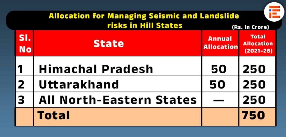 ಅದೇ ರೀತಿ ಭೂಕಂಪ ಮತ್ತು ಭೂ ಕುಸಿತಗಳನ್ನು ತಡೆಗಟ್ಟಲು 2021-22ರಿಂದ 2025-26ರವರೆಗೆ ಹಿಮಾಚಲ ಪ್ರದೇಶ, ಉತ್ತರಾಖಂಡ್ ಮತ್ತು ಈಶಾನ್ಯ ರಾಜ್ಯಗಳಿಗೆ ತಲಾ 250 ಕೋಟಿಯಂತೆ ಒಟ್ಟಾರೆ 750 ಕೋಟಿ ರುಪಾಯಿಗಳನ್ನು ಹಂಚಿಕೆ ಮಾಡಿದೆ.