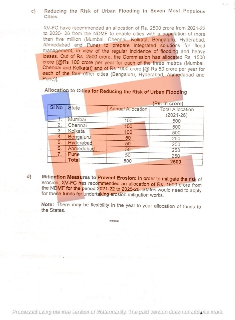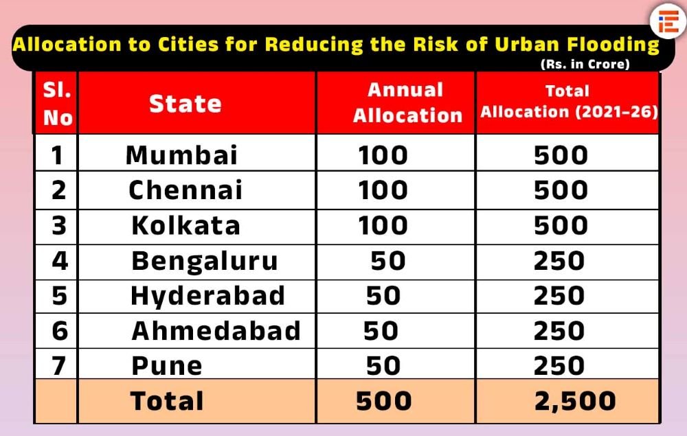 ಹಾಗೆಯೇ ಬೆಂಗಳೂರು ನಗರ, ಮುಂಬೈ, ಚೆನ್ನೈ, ಕೋಲ್ಕತ್ತಾ, ಹೈದರಾಬಾದ್, ಅಹಮದಾಬಾದ್ ಮತ್ತು ಪುಣೆ ರಾಜ್ಯಕ್ಕೆ ವಾರ್ಷಿಕವಾಗಿ 500 ಕೋಟಿ ರು ಹಂಚಿಕೆ ಮಾಡಿತ್ತು. 2021-26ರ ಅವಧಿಯಲ್ಲಿ ಈ ನಗರಗಳಿಗೆ ಒಟ್ಟಾರೆ 2,500 ಕೋಟಿ ರುಪಾಯಿ ಅನುದಾನ ಹಂಚಿಕೆಯಾಗಿದೆ. ಇದರಲ್ಲಿ ಬೆಂಗಳೂರು ನಗರಕ್ಕೆ ವಾರ್ಷಿಕ 50 ಕೋಟಿಯಂತೆ 2021-26ರವರೆಗೆ 250 ಕೋಟಿ ರುಪಾಯಿ ಹಂಚಿಕೆ ಮಾಡಿದೆ.