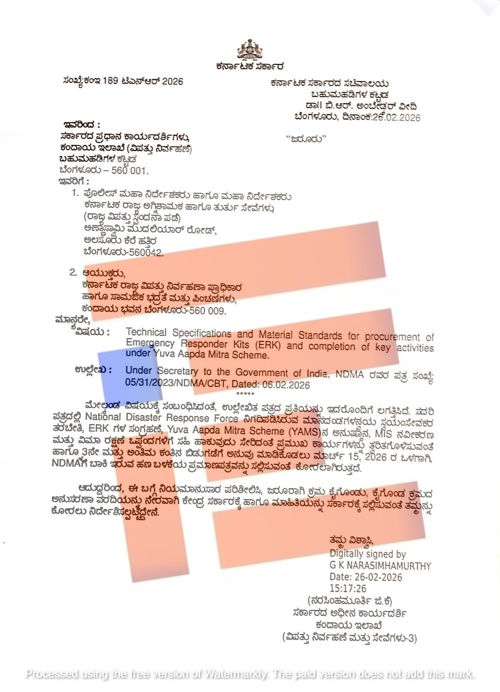 ಈ ಪತ್ರವನ್ನಾಧರಿಸಿ ಕರ್ನಾಟಕ ಸರ್ಕಾರದ ಕಂದಾಯ ಇಲಾಖೆಯ ವಿಪತ್ತು ನಿರ್ವಹಣೆ ವಿಭಾಗವು ಕರ್ನಾಟಕ ರಾಜ್ಯ ವಿಪತ್ತು ನಿರ್ವಹಣಾ ಪ್ರಾಧಿಕಾರ ಮತ್ತು ಕರ್ನಾಟಕ ರಾಜ್ಯ ಅಗ್ನಿಶಾಮಕ ಮತ್ತು ತುರ್ತು ಸೇವೆಗಳ ಪೊಲೀಸ್ ಮಹಾನಿರ್ದೇಶಕರಿಗೆ 2026ರ ಫೆ.26ರಂದು ಪತ್ರ ಬರೆದಿದೆ. ಅಗ್ನಿಶಾಮಕ ಇಲಾಖೆಗೆ ಪತ್ರ ಬರೆಯುವ ಮುನ್ನ ಅಧಿಕಾರಿಗಳು ಸಚಿವ ಕೃಷ್ಣಬೈರೇಗೌಡ ಅವರೊಂದಿಗೆ ಚರ್ಚಿಸಿದ್ದಾರೆ ಎಂದು ಗೊತ್ತಾಗಿದೆ.