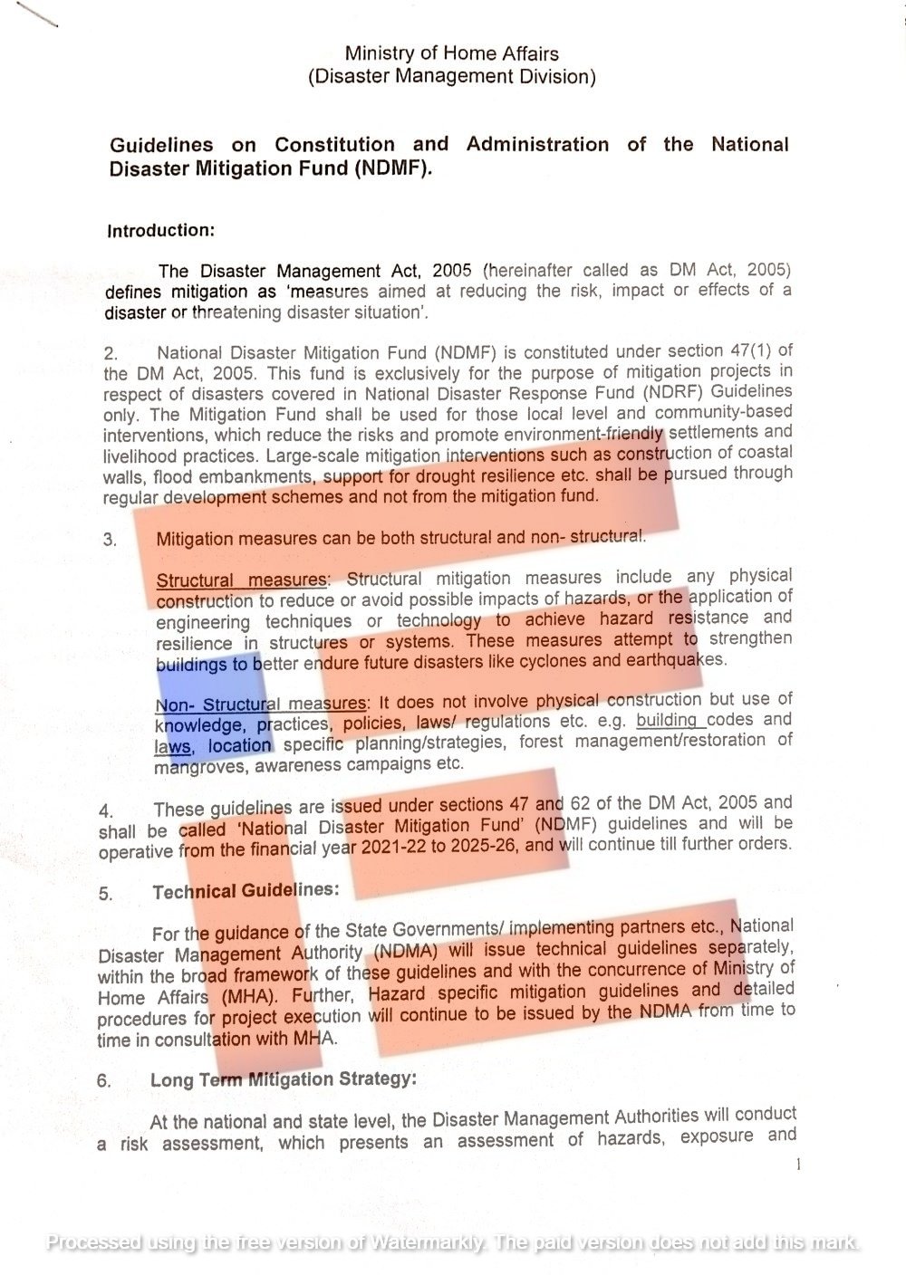 ಮೊದಲ ಬಾರಿಗೆ ಸರ್ಕಾರವು ರಾಷ್ಟ್ರೀಯ ಮತ್ತು ರಾಜ್ಯ ಮಟ್ಟದಲ್ಲಿ ವಿಪತ್ತು ಅಪಾಯಗಳನ್ನು ತಗ್ಗಿಸಲು ಮಾತ್ರ ಹಣವನ್ನು ಹಂಚಿಕೆ ಮಾಡಿತ್ತು. ಇದು ವಿಪತ್ತುಗಳ ಪರಿಣಾಮವನ್ನು ಕಡಿಮೆ ಮಾಡಲು ತಗ್ಗಿಸುವ ಚಟುವಟಿಕೆಗಳನ್ನು ಕೈಗೊಳ್ಳಲು ರಾಜ್ಯಗಳಿಗೆ ಸಹಾಯ ಮಾಡಲಿದೆ. ಕೇಂದ್ರ ಸರ್ಕಾರವು ಎಸ್ಡಿಎಂಫ್ಎಫ್ನಲ್ಲಿ ಕೇಂದ್ರದ ಪಾಲಾಗಿ ಎಲ್ಲಾ ರಾಜ್ಯಗಳಿಗೆ ಶೇ 75 (ಈಶಾನ್ಯ ಮತ್ತು ಹಿಮಾಲಯನ್ ರಾಜ್ಯಗಳಿಗೆ ಶೇ 90) ಕೊಡುಗೆ ನೀಡುತ್ತಿದೆ.