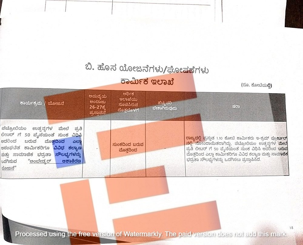 ರಾಜ್ಯದಲ್ಲಿ ಪ್ರಸ್ತುತ 1.10 ಕೋಟಿ ಕಾರ್ಮಿಕರು ಇ-ಶ್ರಮ್ ಪೋರ್ಟಲ್‌ನಲ್ಲಿ ನೋಂದಾಯಿಸಿದ್ದಾರೆ. ಪೆಟ್ರೋಲಿಯಂ ಉತ್ಪನ್ನಗಳ ಮೇಲೆ ಪ್ರತಿ ಲೀಟರ್‍‌ಗೆ 50 ಪೈಸೆಯಂತೆ ಸುಂಕ ವಿಧಿಸಿ ಅದರಿಂದ ಬರುವ ಮೊತ್ತದಿಂದ ಎಲ್ಲಾ ಕಾರ್ಮಿಕರಿಗೂ ವಿವಿಧ ಕಲ್ಯಾಣ ಮತ್ತು ಸಾಮಾಜಿಕ ಭದ್ರತಾ ಸೌಲಭ್ಯಗಳನ್ನು ಒದಗಿಸಬಹುದು ಎಂದು ಕಾರ್ಮಿಕ ಇಲಾಖೆಯು ಪ್ರಸ್ತಾವಿಸಿದೆ. ಆದರೆ ಈ ಯೋಜನೆಗೆ ಎಷ್ಟು ಮೊತ್ತವನ್ನು ಸಂಗ್ರಹಿಸಬಹುದು ಎಂದು ಅಂದಾಜಿಸಿಲ್ಲ.