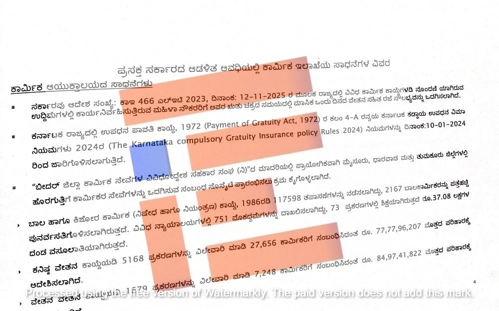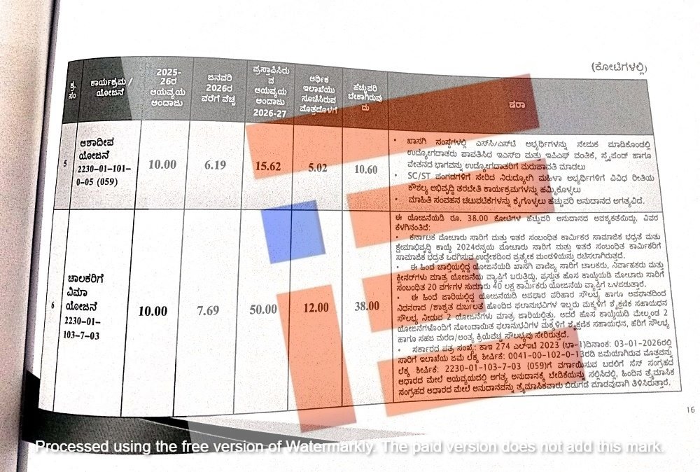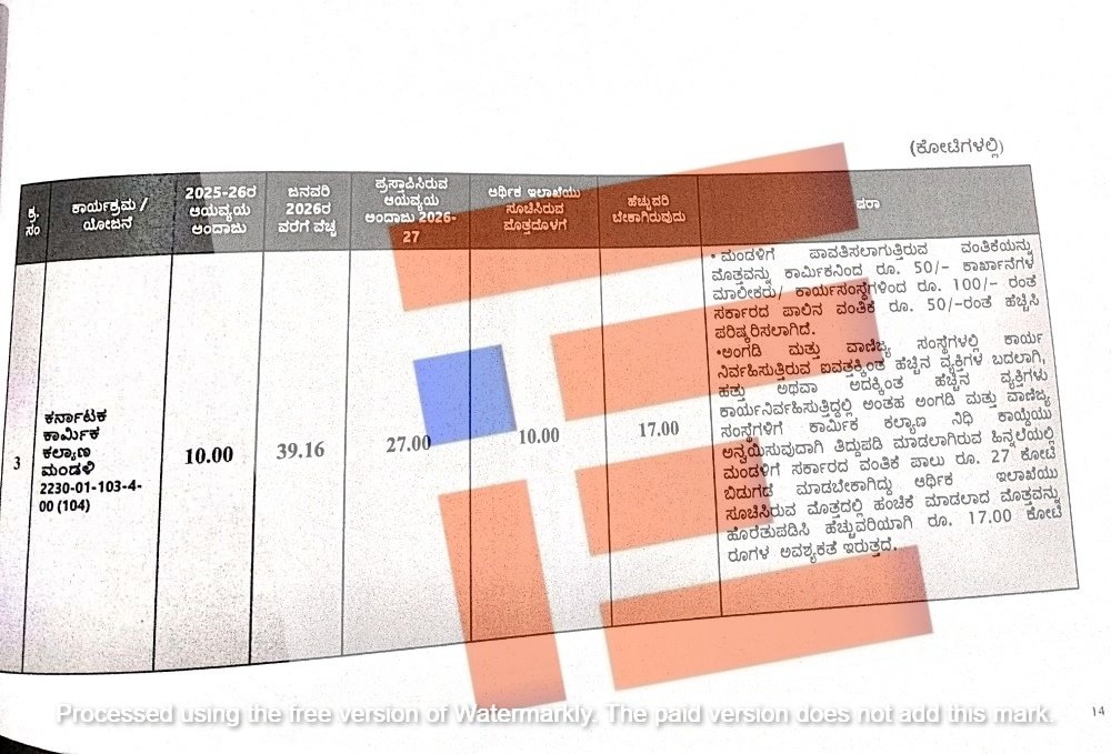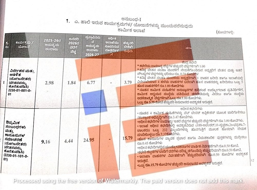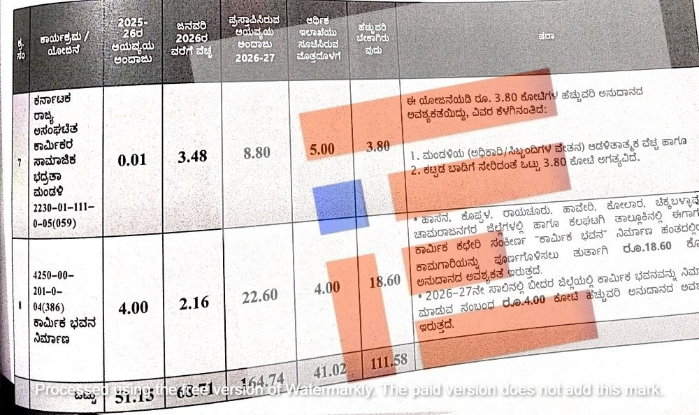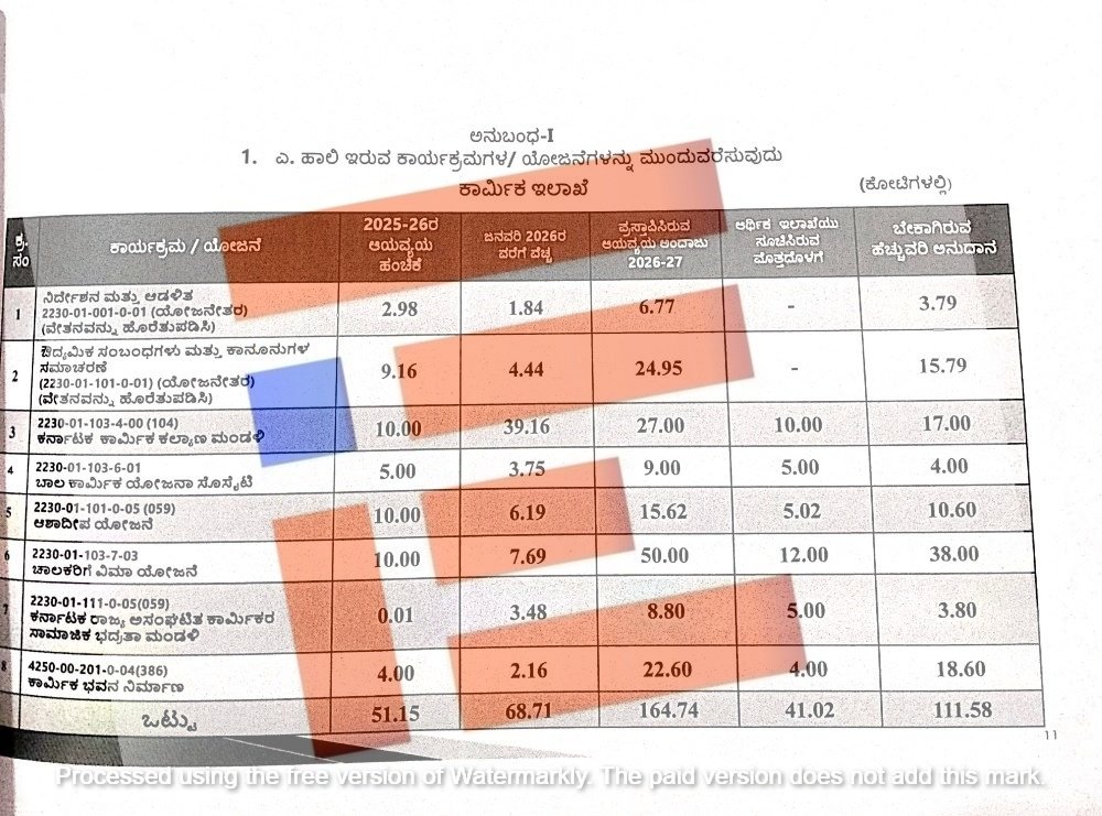 2026-27ನೇ ಸಾಲಿನ ಆಯವ್ಯಯಕ್ಕೆ ಸಂಬಂಧಿಸಿದಂತೆ ಕಾರ್ಮಿಕ ಇಲಾಖೆಯು ಪ್ರಸ್ತಾವಿಸಿರುವ ಸಮಗ್ರ ಯೋಜನೆಗಳ ಪಟ್ಟಿಯು ‘ದಿ ಫೈಲ್‌’ಗೆ ಲಭ್ಯವಾಗಿದೆ.