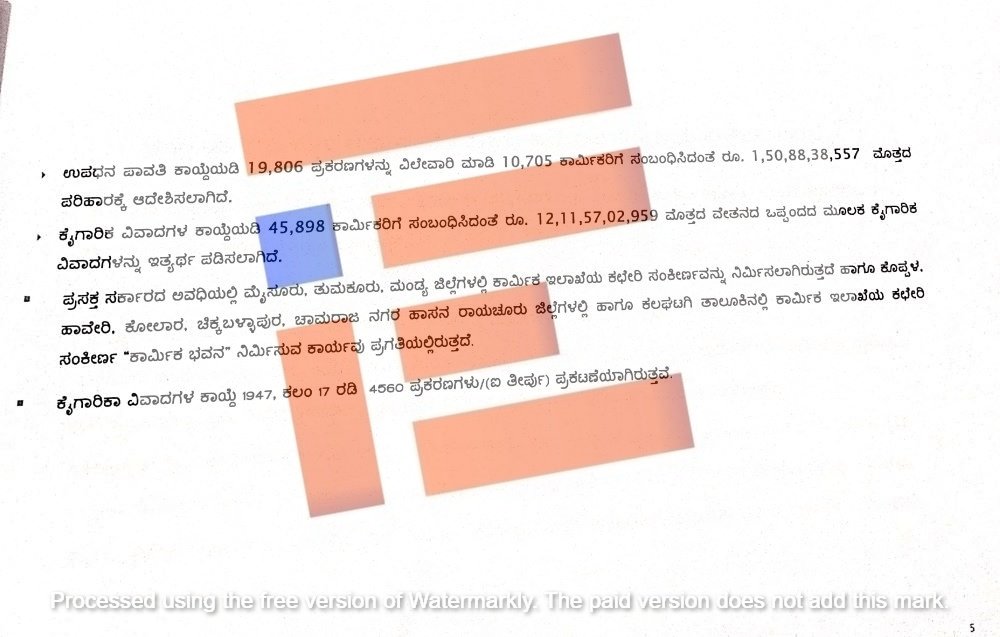 ಕೈಗಾರಿಕೆ ವಿವಾದಗಳ ಕಾಯ್ದೆಯಡಿ 45,898 ಕಾರ್ಮಿಕರಿಗೆ ಸಂಬಂಧಿಸಿದಂತೆ 12,11,57,02,959 ಮೊತ್ತದ ವೇತನ ಒಪ್ಪಂದ ಮೂಲಕ ಕೈಗಾರಿಕೆ ವಿವಾದಗಳನ್ನು ಇತ್ಯರ್ಥಪಡಿಸಿದೆ. ಉಪಧನ ಪಾವತಿ ಕಾಯ್ದೆಯಡಿ 19,806 ಪ್ರಕರಣಗಳನ್ನು ವಿಲೇವಾರಿ ಮಾಡಿ 10,705 ಕಾರ್ಮಿಕರಿಗೆ ಸಂಬಂಧಿಸಿದಂತೆ 1,50,88,38,557 ಮೊತ್ತದ ಪರಿಹಾರಕ್ಕೆ ಆದೇಶಿಸಿದೆ ಎಂದು ಪಟ್ಟಿ ಒದಗಿಸಿರುವುದು ತಿಳಿದು ಬಂದಿದೆ.