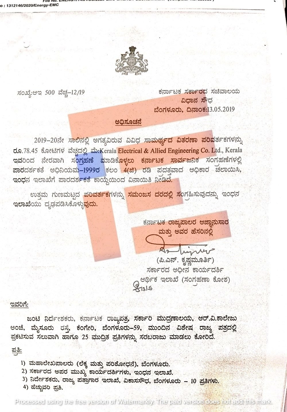 2019-20ನೇ ಸಾಲಿನಲ್ಲಿ ಅಗತ್ಯವಿದ್ದ ವಿವಿಧ ಸಾಮರ್ಥ್ಯದ ವಿದ್ಯುತ್ ವಿತರಣಾ ಪರಿವರ್ತಕಗಳನ್ನು 78.45 ಕೋಟಿ ರು ವೆಚ್ಚದಲ್ಲಿ ಕೇರಳ ಎಲೆಕ್ಟ್ರಿಕಲ್ ಅಲೈಡ್ ಇಂಜಿನಿಯರಿಂಗ್ ಕಂಪನಿಯಿಂದ ನೇರವಾಗಿ ಖರೀದಿಸಲು 2019ರ ಮೇ 13ರಲ್ಲೇ 4 ಜಿ ವಿನಾಯಿತಿ ನೀಡಿತ್ತು.