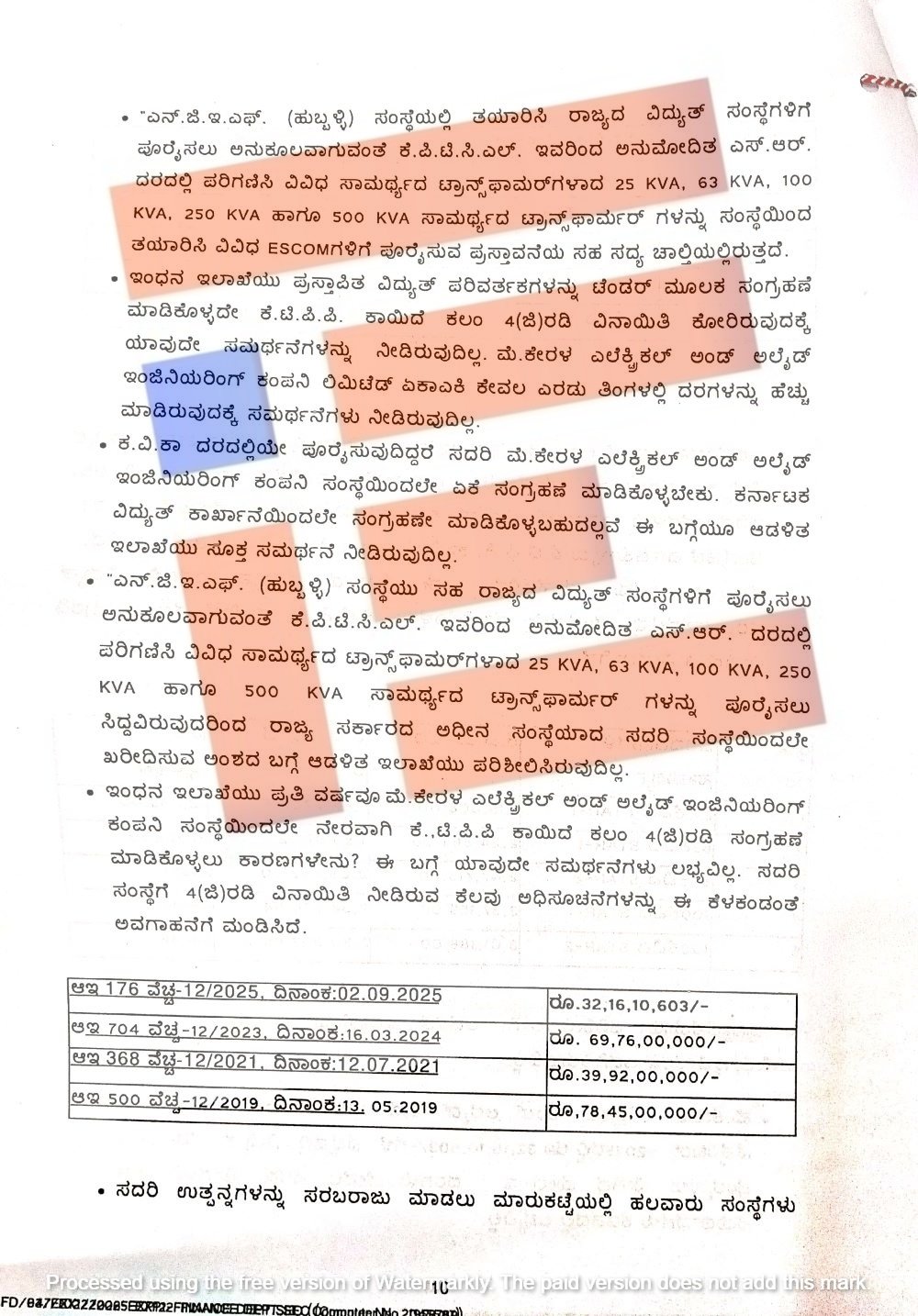 ಇಂಧನ ಇಲಾಖೆಯು ಪ್ರಸ್ತಾವಿತ ವಿದ್ಯುತ್ ಪರಿವರ್ತಕಗಳನ್ನು ಟೆಂಡರ್ ಮೂಲಕ ಸಂಗ್ರಹಣೆ ಮಾಡಿಕೊಳ್ಳದೇ ಕೆಟಿಪಿಪಿ ಕಾಯ್ದೆ ಕಲಂ 4 ಜಿ ಅಡಿ ವಿನಾಯಿತಿ ಕೋರಿರುವುದಕ್ಕೆ ಯಾವುದೇ ಸಮರ್ಥನೆಯನ್ನೂ ನೀಡಿಲ್ಲ. ಅಲ್ಲದೇ ಕೇರಳ ಎಲೆಕ್ಟ್ರಿಕಲ್ ಅಂಡ್ ಅಲೈಡ್ ಇಂಜಿನಿಯರಿಂಗ್ ಕಂಪನಿ ಲಿಮಿಟೆಡ್ ಏಕಾಏಕೀ ಕೇವಲ ಎರಡು ತಿಂಗಳಲ್ಲಿ ದರಗಳನ್ನು ಹೆಚ್ಚು ಮಾಡಿದ್ದಕ್ಕೆ ಯಾವುದೇ ಸಮರ್ಥನೆಯನ್ನೂ ನೀಡಿರಲಿಲ್ಲ.