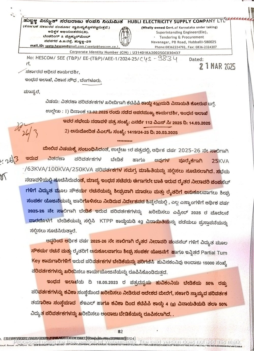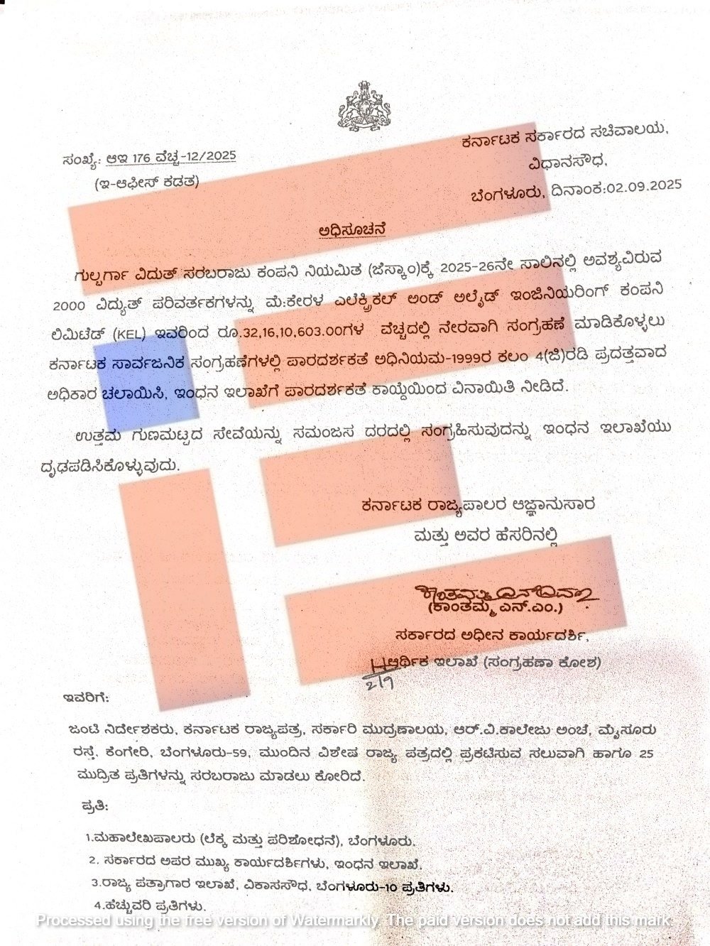 ಗುಲ್ಬರ್ಗ ವಿದ್ಯುತ್ ಸರಬರಾಜು ಕಂಪನಿ ವ್ಯಾಪ್ತಿಯಲ್ಲಿ 2025-26ನೇ ಸಾಲಿನಲ್ಲಿ ಅವಶ್ಯಕವಿರುವ 2,000 ವಿದ್ಯುತ್ ಪರಿವರ್ತಕಗಳನ್ನು 32.16 ಕೋಟಿ ರು ವೆಚ್ಚದಲ್ಲಿ ಕೇರಳ ಎಲೆಕ್ಟ್ರಿಕಲ್ ಅಲೈಡ್ ಇಂಜಿನಿಯರಿಂಗ್ ಕಂಪನಿಯಿಂದ ನೇರವಾಗಿ ಖರೀದಿಸಲು 2025ರ ಸೆಪ್ಟಂಬರ್ 2ರಂದು 4 ಜಿ ವಿನಾಯಿತಿ ನೀಡಿತ್ತು.