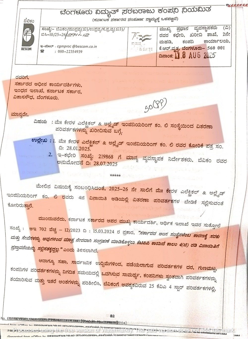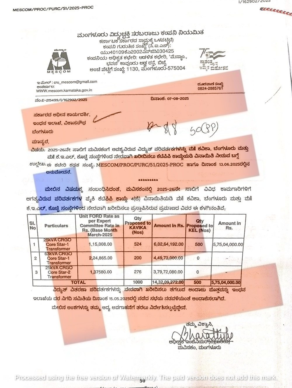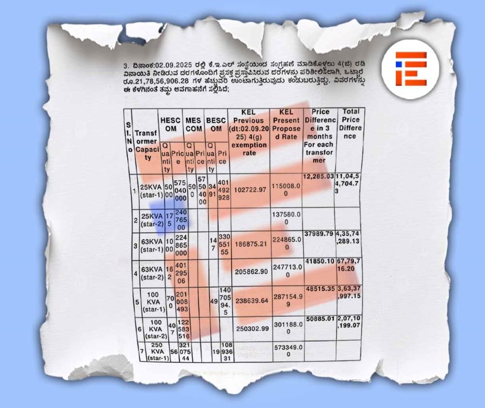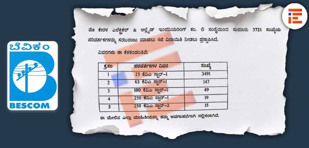ಈ ಪತ್ರವನ್ನಾಧರಿಸಿ ಕೇರಳ ಎಲೆಕ್ಟ್ರಿಕಲ್ ಅಲೈಡ್ ಇಂಜಿನಿಯರಿಂಗ್ ಕಂಪನಿಯಿಂದಲೇ 3,721 ಸಂಖ್ಯೆಯ ವಿದ್ಯುತ್ ಪರಿವರ್ತಕಗಳನ್ನು ಖರೀದಿಸಲು ಇಂಧನ ಇಲಾಖೆಗೆ 2025ರ ಆಗಸ್ಟ್ 8ರಂದೇ ಬೆಸ್ಕಾಂ ಕೂಡ ಪ್ರಸ್ತಾವ ಸಲ್ಲಿಸಿತ್ತು.