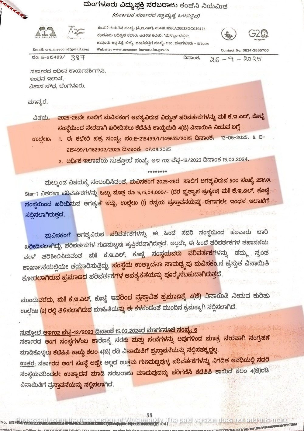 ಮಂಗಳೂರು ವಿದ್ಯುತ್ ಸರಬರಾಜು ಕಂಪನಿಯೂ ಕೇರಳ ಎಲೆಕ್ಟ್ರಿಕಲ್ ಅಲೈಡ್ ಇಂಜಿನಿಯರಿಂಗ್ ಕಂಪನಿಯಿಂದಲೇ ವಿದ್ಯುತ್ ಪರಿವರ್ತಕಗಳನ್ನು 5.75 ಕೋಟಿ ವೆಚ್ಚದಲ್ಲಿ ನೇರವಾಗಿ ಖರೀದಿಸಲು 2025ರ ಆಗಸ್ಟ್ 7ರಂದೇ 4 ಜಿ ವಿನಾಯಿತಿ ಕೋರಿತ್ತು.