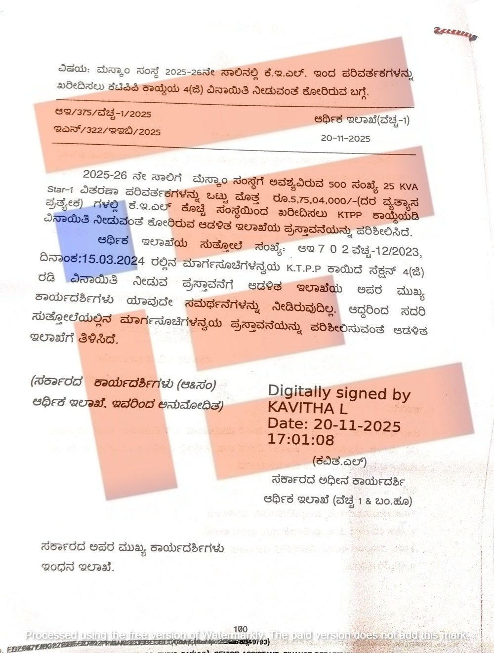 ಕೇರಳ ಎಲೆಕ್ಟ್ರಿಕಲ್ ಅಂಡ್ ಅಲೈಡ್ ಇಂಜನಿಯರಿಂಗ್ ಲಿಮಿಟೆಡ್ನಿಂದಲೇ 174.73 ಕೋಟಿ ರು ಮೊತ್ತದಲ್ಲಿ ವಿದ್ಯುತ್ ಪರಿವರ್ತಕಗಳನ್ನು ನೇರವಾಗಿ ಖರೀದಿಸಲು ಮುಂದಾಗಿದೆ. ಇದಕ್ಕಾಗಿ 4 ಜಿ ವಿನಾಯಿತಿಯನ್ನೂ ಕೋರಿದೆ. ಒಂದೊಮ್ಮೆ ಇದಕ್ಕೆ ಸಹಮತಿ ದೊರೆತಲ್ಲಿ ಸ್ಪರ್ಧಾತ್ಮಕ ದರಗಳಿಂದ ಸಿಗಬಹುದಾದ ಕಡಿಮೆ ದರಗಳ ಲಾಭದಿಂದ ರಾಜ್ಯಕ್ಕೆ ವಂಚನೆಯಾಗಲಿದೆ. ಮತ್ತು ಸಂಪನ್ಮೂಲ ದುರ್ಬಳಕೆ ಅಗುವ ಸಾಧ್ಯತೆಯೂ ಇದೆ. ಅಲ್ಲದೇ ಕೆಟಿಪಿಪಿ ಆಶಯಕ್ಕೆ ವ್ಯತಿರಿಕ್ತವಾಗಲಿದೆ ಎಂದು ಆರ್ಥಿಕ ಇಲಾಖೆ ಹೇಳಿತ್ತು. ಈ ಸಂಬಂಧ ಕಡತವು ಚಲನವಲನದಲ್ಲಿದೆ.