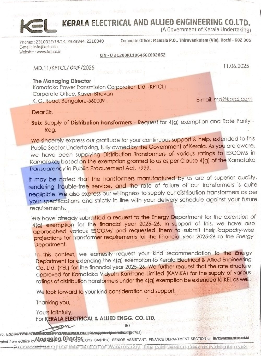 ಅಲ್ಲದೇ 2019, 2024 ಮತ್ತು 2025ರಲ್ಲಿಯೂ ಕೇರಳ ಎಲೆಕ್ಟ್ರಿಕಲ್ ಅಂಡ್ ಅಲೈಡ್ ಇಂಜಿನಿಯರಿಂಗ್ ಕಂಪನಿಯಿಂದಲೇ ವಿದ್ಯುತ್ ಪರಿವರ್ತಕಗಳನ್ನು ಖರೀದಿಸಲು ಆರ್ಥಿಕ ಇಲಾಖೆಯು 4 ಜಿ ವಿನಾಯಿತಿ ನೀಡಿದೆ.