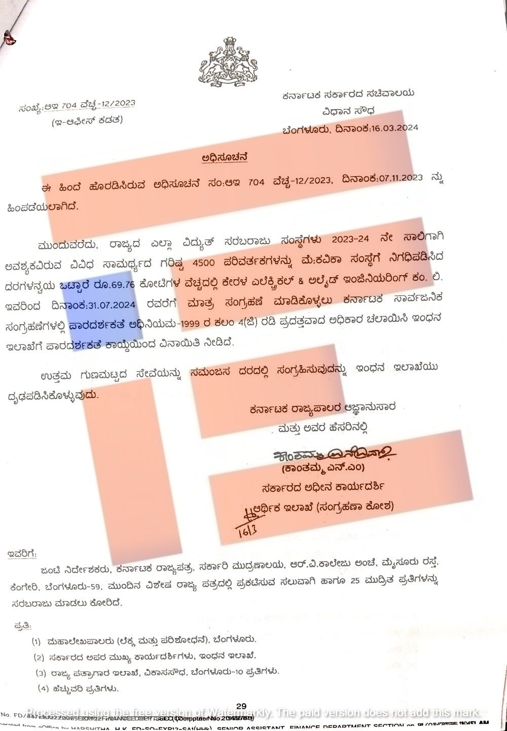 ಕೇರಳ ಸರ್ಕಾರಿ ಕಂಪನಿಯಿಂದ ಟ್ರಾನ್ಸ್ಫಾರ್ಮ್ರ್ಗಳ ಖರೀದಿ; 174.73 ಕೋಟಿ ರು ಮೊತ್ತಕ್ಕೆ 4 (ಜಿ) ಪ್ರಸ್ತಾವ