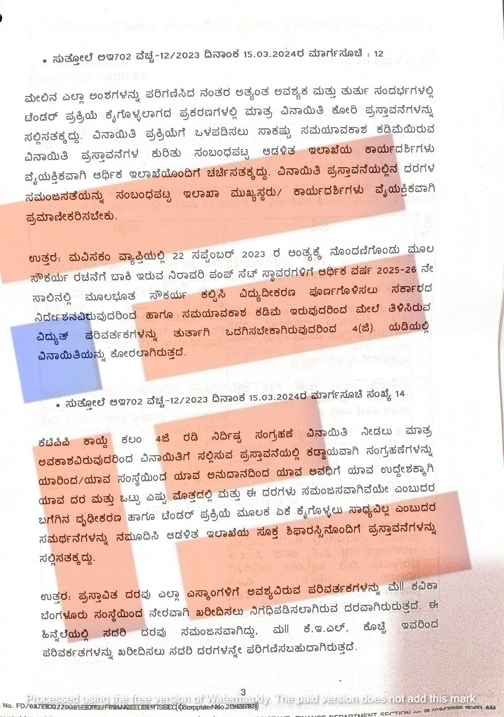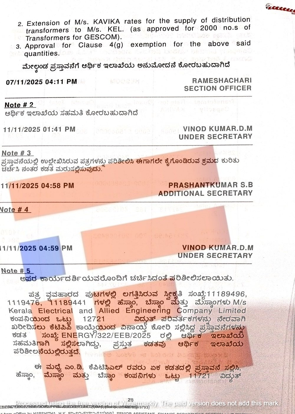 ಹೆಸ್ಕಾಂ, ಬೆಸ್ಕಾಂ ಮತ್ತು ಮೆಸ್ಕಾಂಗಳು ಕೇರಳ ಎಲೆಕ್ಟ್ರಿಕಲ್ ಅಂಡ್ ಅಲೈಡ್ ಇಂಜನಿಯರಿಂಗ್ ಲಿಮಿಟೆಡ್ನಿಂದಲೇ ನೇರವಾಗಿ ಒಟ್ಟಾರೆ 12,721 ವಿದ್ಯುತ್ ಪರಿವರ್ತಕಗಳನ್ನು ಖರೀದಿಸಲು ಕೆಟಿಪಿಪಿ ಕಾಯ್ದೆಯ 4 ಜಿ ವಿನಾಯಿತಿ ಕೋರಿವೆ. ಈ ಕಡತವೂ ಆರ್ಥಿಕ ಇಲಾಖೆಯ ಪರಿಶೀಲನೆಯಲ್ಲಿದೆ.