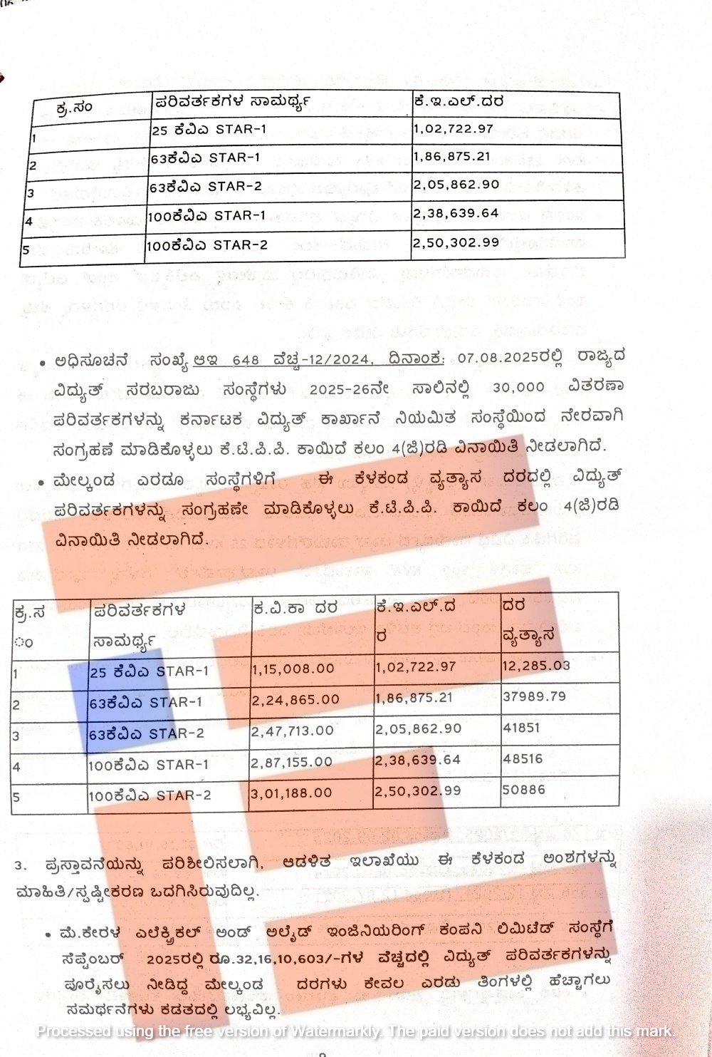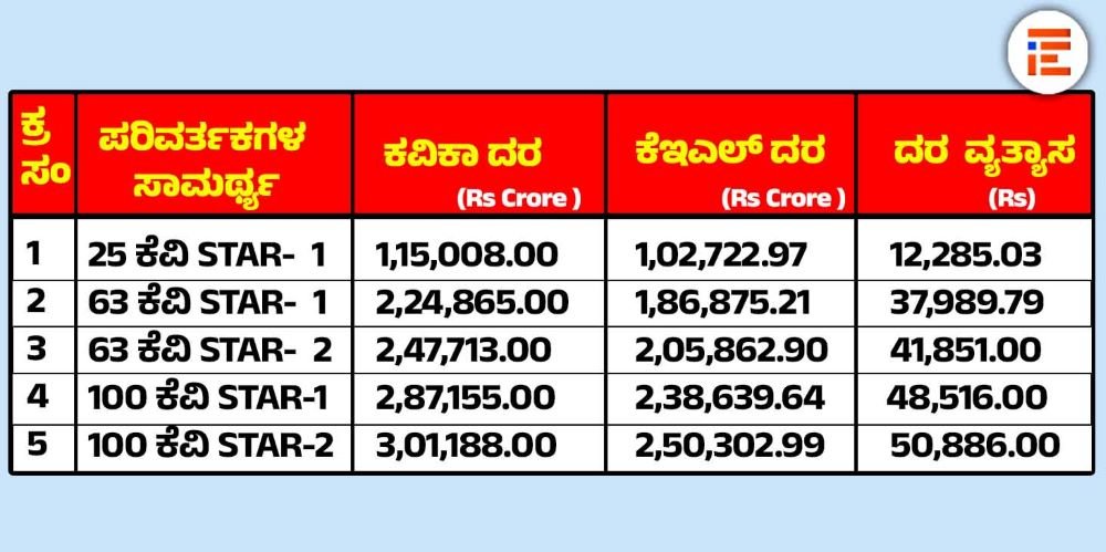 ಅದೇ ರೀತಿ 63 ಕೆವಿಎ ಸ್ಟಾರ್ 1 ಸಾಮರ್ಥ್ಯದ ವಿದ್ಯುತ್ ಪರಿವರ್ತಕಕ್ಕೆ ಕವಿಕಾವು 2,24,865.00 ರು ದರ ನಿಗದಿಪಡಿಸಿದ್ದರೇ ಕೆಇಎಲ್, 1,86,875.21 ರು ನಿಗದಿಪಡಿಸಿತ್ತು.