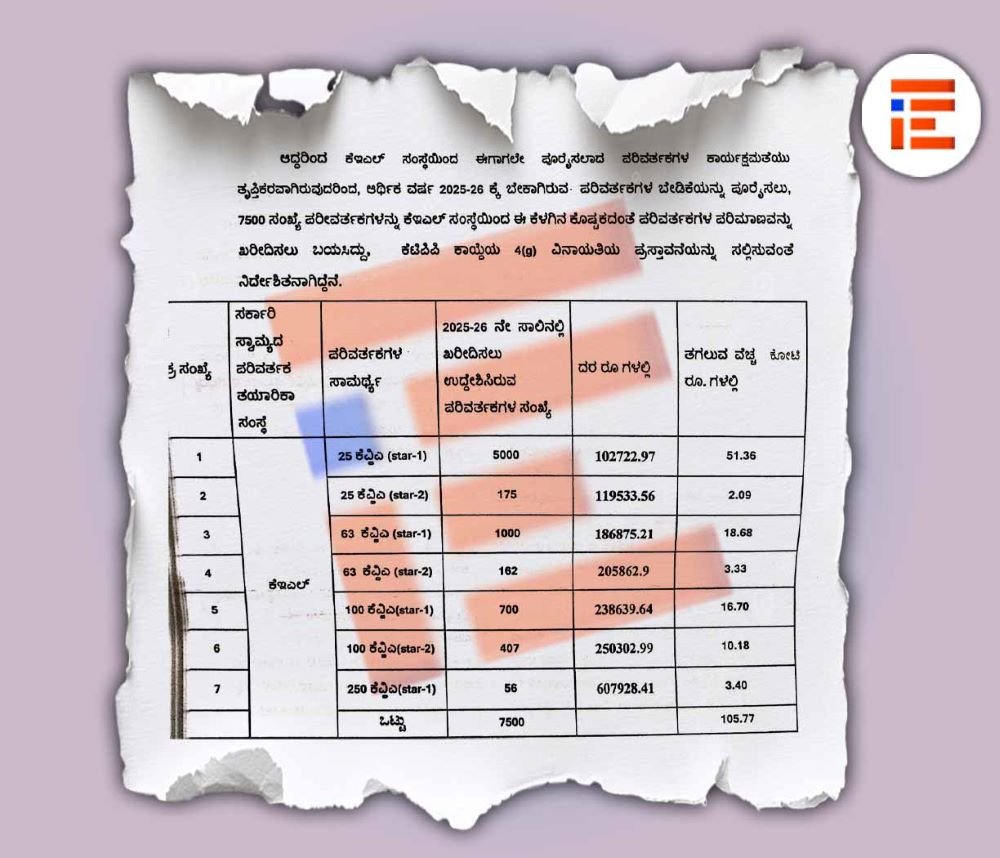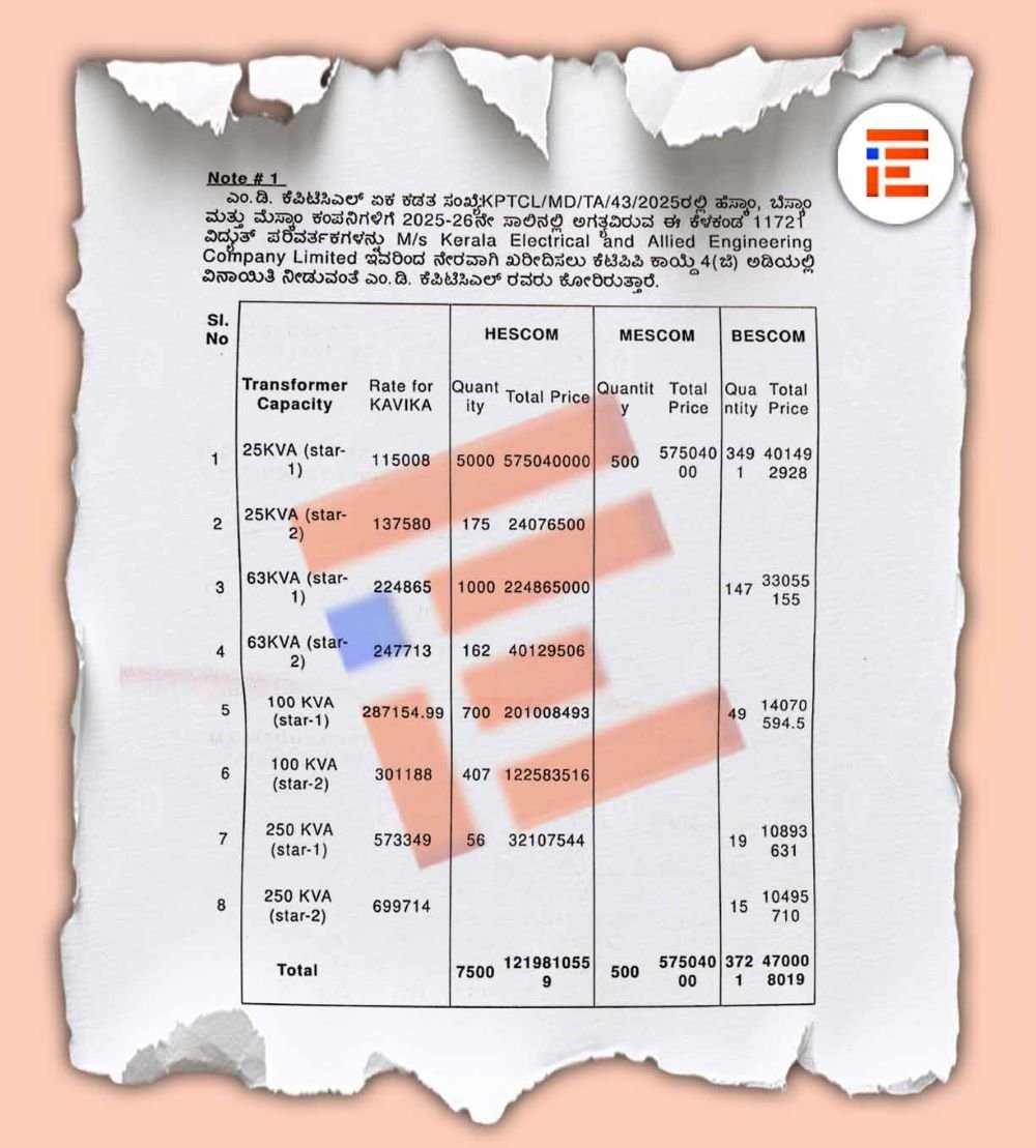 2025-26ನೇ ಸಾಲಿನಲ್ಲಿ ಒಟ್ಟಾರೆ 7,500 ವಿದ್ಯುತ್ ಪರಿವರ್ತಕಗಳನ್ನು ಕೇರಳ ಎಲೆಕ್ಟ್ರಿಕಲ್ ಅಂಡ್ ಅಲೈಡ್ ಇಂಜಿನಿಯರಿಂಗ್ ಕಂಪನಿಯಿಂದಲೇ 105.77 ಕೋಟಿ ರು ವೆಚ್ಚದಲ್ಲಿ ಖರೀದಿಸಲು ಮುಂದಾಗಿತ್ತು.