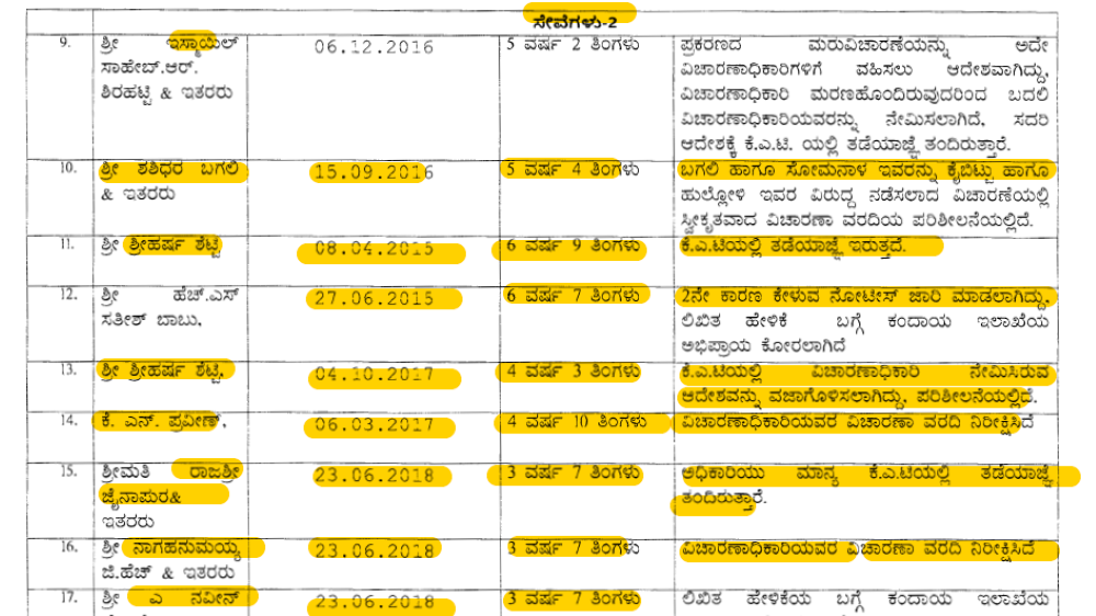 ನಿಯಮ 11 ರಡಿ ಇಸ್ಮಾಯಿಲ್ ಸಾಹೇಬ್, ಶ್ರೀಹರ್ಷ ಶೆಟ್ಟಿ, ಹೆಚ್ ಎಸ್ ಸತೀಶ್ ಬಾಬು, ಜಿ ಹೆಚ್ ನಾಗಹನುಮಯ್ಯ, ಎ ನವೀನ್ ಜೋಸೆಫ್, ಡಾ ಜಿ ಸುರೇಶ್, ಎಲ್ ಸಿ ನಾಗರಾಜ್, ಹೆಚ್ ವಿ ಗಿರೀಶ್, ಡಾ ಬಿ ಆರ್ ಹರೀಶ್, ಗಿರೀಶ್ ನಂದನ್, ಹೆಚ್ ವಿ ಗಿರೀಶ್, ಡಾ ಮಂಜುನಾಥ್ ವಿ, ಟಿ ಜಿ ಗುರುಪ್ರಸಾದ್, ಡಾ ಎಂ ಜಿ ಶಿವಣ್ಣ, ದಯಾನಂದ ಪಾಟೀಲ್, ಮಲ್ಲೇಶ್ ಎಂ ತಂಗಾ, ಉಮೇಶ್ ಜೆ, ಶಿವಾನಂದ ಪಿ ಸಾಗರ, ಟಿ ಸಿ ಹಾದಿಮನಿ, ಬಾಳಪ್ಪ ಹಂದಿಗುಂದ, ಡಾ ಎನ್ ಸಿ ವೆಂಕಟರಾಜು, ಎಸ್ ಎಸ್ ಸಂಪಗಾವಿ, ಅರುಣ ಪ್ರಭಾ, ತೇಜಸ್ ಕುಮಾರ್, ಡಾ ಕಾಂತರಾಜ್, ಎ ಮರೀಗೌಡ, ಆರ್ ವೆಂಕಟೇಶ್, ಪಿ ಎಸ್ ಮಂಜುನಾಥ್, ಕೆ ರಂಗನಾಥ್, ಎ ಬಿ ಬಸವರಾಜು, ಪಿ ಜಯ ಮಾಧವ, ಸಿ ಎಲ್ ಆನಂದ್, ಸಿ ನಾಗರಾಜು, ಕುಸುಮಾಕುಮಾರಿ, ಶಂಕರ ವಣಿಕ್ಯಾಳ, ಎಂ ಎಸ್ ಎನ್ ಬಾಬು, ಅಮರೇಶ್ ಹೆಚ್, ಬಿ ಮಲ್ಲಿಕಾರ್ಜುನ, ಎಲಿಷಾ ಆಂಡ್ರೂಸ್, ಕೆ ಎಂ ಸುರೇಶ್ ಕುಮಾರ್ ಸಿದ್ದಲಿಂಗರೆಡ್ಡಿ, ವೈ ಎಂ ರಾಮಚಂದ್ರ ಮೂರ್ತಿ, ಹೆಚ್ ರಾಮಾಂಜನೇಯ, ಜಿ ಸಿ ಅನಿಲ್ ಕುಮಾರ್, ಮಹಮ್ಮದ್ ಖಲೀಮುಲ್ಲಾ, ವಿ ಶಶಿಕಲಾ, ಜಿ ಸಿ ರಾಜಶೇಖರ್, ಸಿ ನಾಗಯ್ಯ, ಅತೀಕ್ ಅಹ್ಮದ್, ಎಸ್ ಪಿ ಕುಲಕರ್ಣಿ, ನಾಗಾ ನಾಯಕ್ ಅವರ ವಿರುದ್ಧ ವಿಚಾರಣೆ ಬಾಕಿ ಇರುವುದು ಪಟ್ಟಿಯಿಂದ ತಿಳಿದು ಬಂದಿದೆ.