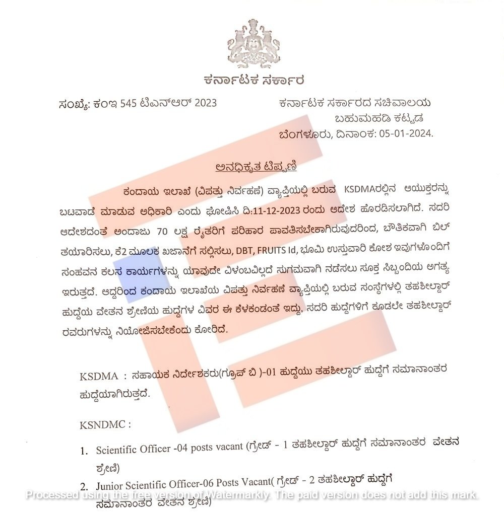 ಕಂದಾಯ ಇಲಾಖೆ (ವಿಪತ್ತು ನಿರ್ವಹಣೆ) ವ್ಯಾಪ್ತಿಯಲ್ಲಿ ಬರುವ ಕೆಎಸ್ಡಿಎಂಎ ಆಯುಕ್ತರನ್ನು ಬಟಾವಡೆ ಮಾಡುವ ಅಧಿಕಾರಿ ಎಂದು 2023ರ ಡಿಸೆಂಬರ್ 11ರಂದು ಘೋಷಿಸಿ ಆದೇಶ ಹೊರಡಿಸಲಾಗಿದೆ. ಈ ಆದೇಶದಂತೆ ಅಂದಾಜು 70 ಲಕ್ಷ ರೈತರಿಗೆ ಪರಿಹಾರ ಪಾವತಿಸಬೇಕಿದೆ. ಭೌತಿಕವಾಗಿ ಬಿಲ್ ತಯಾರಿಸಲು, ಕೆ2 ಮೂಲಕ ಖಜಾನೆಗೆ ಸಲ್ಲಿಸಲು, ಡಿಬಿಡಿ, ಫ್ರೂಟ್ಸ್ ಐಡಿ , ಭೂಮಿ ಉಸ್ತುವಾರಿ ಕೋಶದೊಂದಿಗೆ ಸಂವಹನ ಕೆಲಸಗಳನ್ನು ಮಾಡಲು ಸೂಕ್ತ ಸಿಬ್ಬಂದಿ ಅಗತ್ಯವಿದೆ. ಹೀಗಾಗಿ ವಿಪತ್ತು ನಿರ್ವಹಣೆ ವ್ಯಾಪ್ತಿಯಲ್ಲಿನ ಸಂಸ್ಥೆಗಳಲ್ಲಿ ತಹಶೀಲ್ದಾರ್ ವೇತನ ಶ್ರೇಣಿಯ 11 ಮಂದಿಯನ್ನು ನಿಯೋಜಿಸಬೇಕು ಎಂದು ಕೋರಿರುವುದು ಟಿಪ್ಪಣಿಯಿಂದ ಗೊತ್ತಾಗಿದೆ.