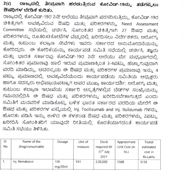 2021ರ ಜುಲೈ 31ರ ಅಂತ್ಯಕ್ಕೆ 2,00,000 ರೆಮ್ಡಿಸಿವಿರ್(100 ಎಂಜಿ) ಖರೀದಿಸಿಟ್ಟುಕೊಳ್ಳಬೇಕು. ಇದಕ್ಕೆ 1,568 ರು. ದರ ನಿಗದಿಪಡಿಸಿರುವ ಉನ್ನತ ಸಮಿತಿಯು ರೆಮ್ಡಿಸಿವಿರ್ ಖರೀದಿಗೆ ಒಟ್ಟು 3.13 ಕೋಟಿ ರು. ವೆಚ್ಚವಾಗಲಿದೆ ಎಂದು ಅಂದಾಜಿಸಿದೆ. ಆದರೆ ಬಹುತೇಕ ಕಂಪನಿಗಳು ರಾಜ್ಯಕ್ಕೆ ರೆಮ್ಡಿಸಿವಿರ್ನ್ನು ಸರಬರಾಜು ಮಾಡದೇ ಮುಕ್ತ ಮಾರುಕಟ್ಟೆಯತ್ತಲೇ ಒಲವು ವ್ಯಕ್ತಪಡಿಸಿದ್ದಾರೆ.